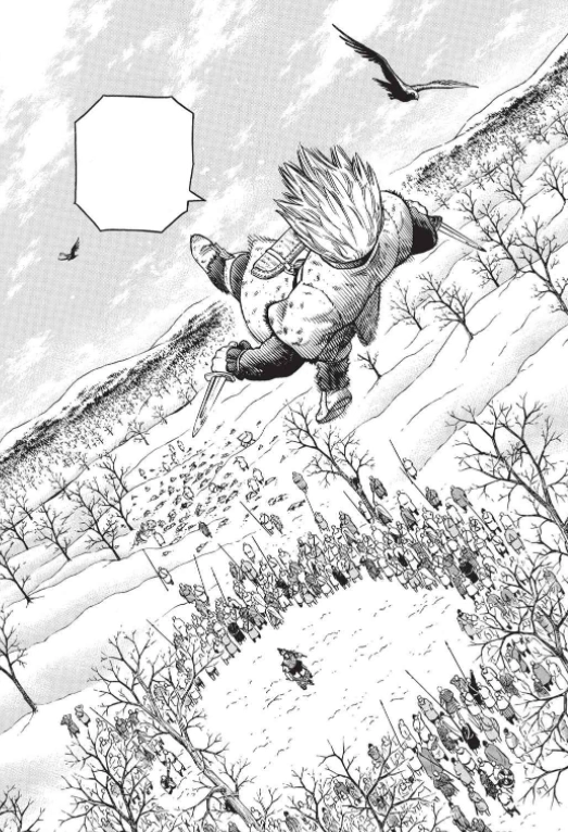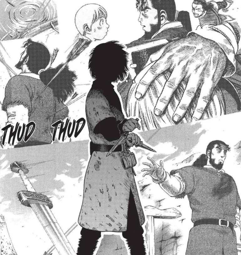 Thorfinn's duel with Thorkell continues. Thorfinn, who knows going straight for the vital points like in London would be bad, notes he has aim for tendons to immobilize Thorkell before going in for the kill. Thorkell compliments Thorfinn on his fighting skills, but comments that his swordwork is mundane and asks if he's ever felt like he's missing something that would make him a complete warrior. Thorkell admits that he himself is missing something and that he was hoping he could learn what it was from the son of Thors. He asks Thorfinn what makes a true warrior, causing Thorfinn to recall his father's last moments. Thorfinn keeps dodging Thorkell's swing and cuts up Thorkell's arms, though the cuts are still too shallow. Thorkell uses his axe to send snow flying at Thorfinn and aims a kick at him while he is momentarily blinded; Thorfinn braces against it by bouncing off, but the force of the kick sends him soaring through the air. Thorfinn crashes near the top of a tree, hitting branches as he comes tumbling down. Canute asks Willibald who embodies love if Ragnar did not love him; Willibald points to a nearby dead man and says he does, as he will not hate, kill or steal, and that death completes a man. Canute asks what the emotion between a parent and child, husband and wife, or Ragnar and him is if it is not love. Willibald says it is discrimination; Ragnar, for whom Canute's life was probably more important than even his own, discriminated and allowed many to die for Canute's sake. Canute understands that the whole world brims with love; the sun, the sky, the mountains, the trees and the breeze. He sheds tears as he wonders how God's creation can hold so much love, while there is none in the hearts of men. Willibald replies that they became pathetic creatures, exiled from Paradise, when their ancestors sinned and turned their backs on God. Thorfinn groans, slowly getting back up from where he fell after crashing into the tree.