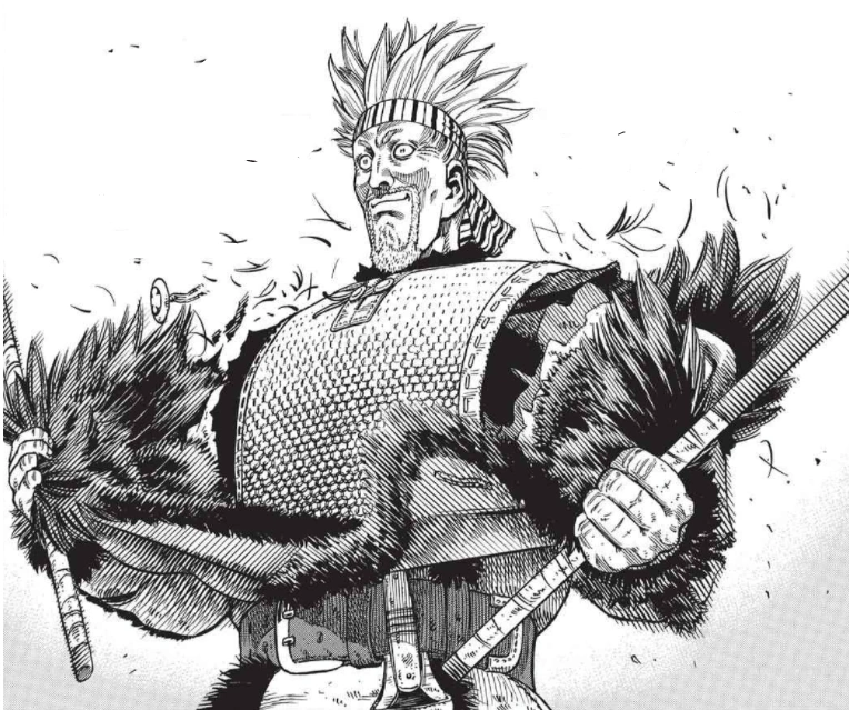 Thorkell's men have finished dispatching of Askeladd's old band and entertain themselves. Some, like Diure and Erik, practice shooting arrows, using Ear's dismembered head as the target. Others loot the corpses and provision carts for anything of value. One comments that the men barely put up a fight and that Thorkell's men may not even have lost a single person; they note that tough ones are hard to find and that they'll never make it to Valhalla at this rate. The looting men notice a crowd is still cheering and wonder if Thorkell's fight is still going, though one notes Thorkell's fights are always over after a few seconds. They get closer and see that Thorfinn is still standing, sweaty but otherwise unharmed, and that he's even managed to draw blood from Thorkell by slashing away at his arms. Thorkell congratulates Thorfinn on his skill and tells him he could count the men who could stand toe-to-toe against Thorfinn on one hand. Thorkell tears off his now wrecked coat, revealing he was indeed wearing the same chainmail as in London. Thorfinn deduces he will have to aim for the tendons and immobilize him before going in for the kill, as going straight for the vital points had not worked out in his favour in London.