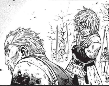 Atli is devastated to find that the band has been killed and that his brother Torgrim, who has survived, does not recognize him. Thorkell tells Canute that he has no right to interfere in a duel; Canute replies it's not much of a duel anymore and suggests he show pride and grace before his followers. Thorkell yells at him, since it's something he already knows. He reiterates that he lost the duel, despite this being precipitated by his men disobeying his orders and interfering, and tells them to let Thorfinn go. Thorfinn rushes Askeladd to leave, but Askeladd says he wants to stay and watch. Canute tells Thorkell he is there to borrow and sled and food and Thorkell asks why he would let him go. Canute tells him he has no value as a hostage, since King Sweyn favours his older brother Harald and sent Canute off to die in battle to prevent splitting the kingdom. He tells Thorkell that if he went free, he would go to Gainsborough to face his father, as it has to be done and he doesn't have much of a life to mourn even if he loses. Thorkell decides to test his resolve to give up his life by punching him in the face, but stops just short of making contact when Canute does not so much as flinch. Thorkell, who recognizes the look in Canute's eyes as the same one he saw in Thors's, says that his only regret was not following Thors back then and losing his chance at finding out what it means to be a true warrior. To the surprise of his men, he says he will fight with Canute, as he'll still be against King Sweyn anyway. Askeladd hysterically laughs, then hands his sword to Canute and admits he is the one who killed Ragnar. He tells Canute to strike him down, or to let him live out his life in loyal service to him. Canute tells him his atonement will be to do Ragnar's share of the lifting. He tells everyone that if they are to follow him, they are off to Gainsborough to drag King Sweyn off of his throne.