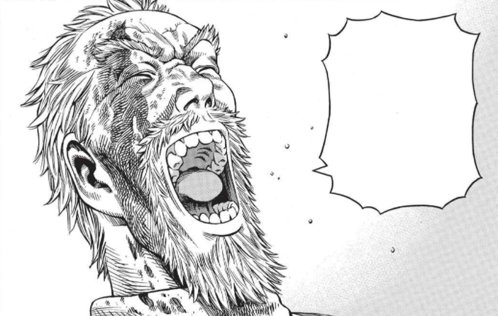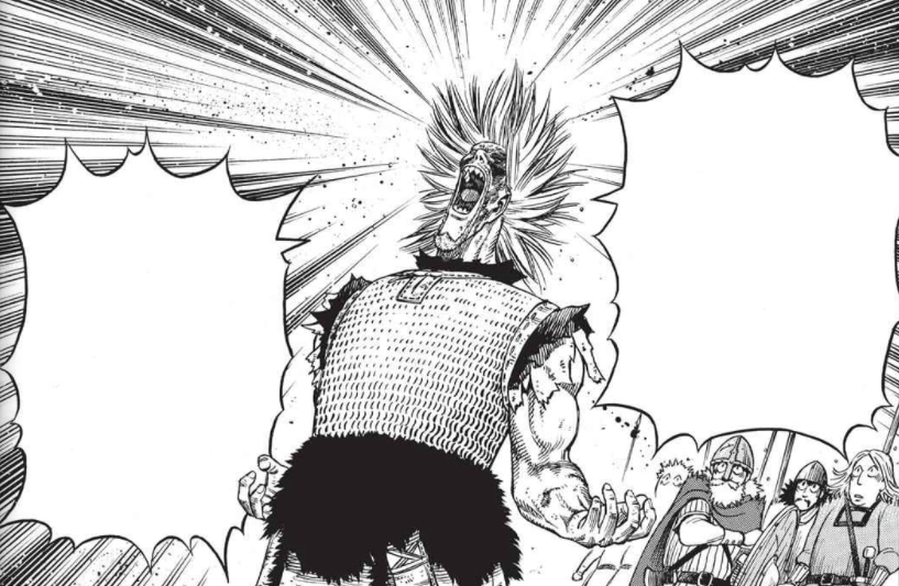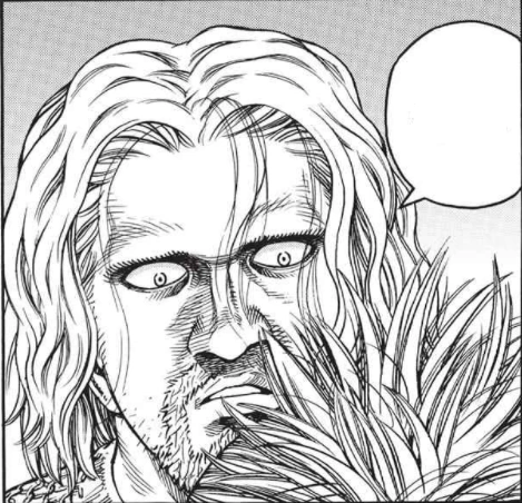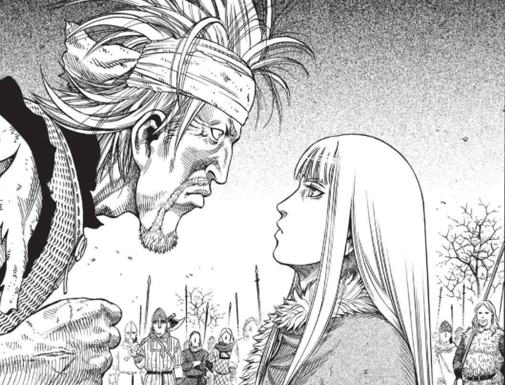 Thorkell yells that he's never had such a bad day in his fifty years, sits down, and calls for mead. Askeladd observes Canute. Thorfinn approaches Askeladd and tells him they should leave quickly before Thorkell changes his mind. Askeladd tells him to leave if he wants to, but that he's staying. Thorfinn, startled, starts to ask him if he thinks it's a joke and why he had to go through all of that torture if he was just going to stay, but Askeladd tells him to stop squalling and watch the good part. Thorkell knocks back some mead and has his eye patched by one of his men. He asks Canute why he is there. Canute tells him he wants a sled and food, both of which Thorkell will be repaid for later. He adds that Thorfinn and Askeladd are his subjects and that he will take them with him. Thorkell asks him if he's dense, as hunters don't typically let prey go when they jump into their grasp. Thorkell directs his men to surrender Canute and "soften him up". Thorfinn yells at Askeladd to give up on the prince and leave already, but Askeladd again tells him to shut up and watch.