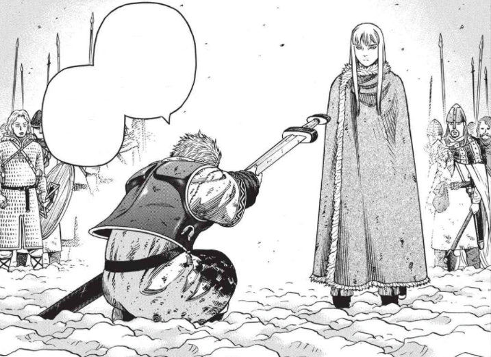 Exhaling and becoming serious again, Askeladd walks over to Canute, kneels and hands him his sword hilt first. He tells Canute that he was the one who killed Lord Ragnar and tells him to strike him down. Canute looks down on him severely and Thorfinn worryingly wonders why Askeladd would tell him that. Askeladd tells Canute that if he would grant him his life, he would see that it is spent in loyal service to him. Canute turns his back on Askeladd, ignoring his sword, and tells him that his atonement will be to do Ragnar's share of the lifting — Thorfinn is relieved. Askeladd accepts the command. Thorkell asks Askeladd what the big idea is and tells him not to copy him; Askeladd replies that he was in Canute's service first. Smiling, Thorkell tells him that they're partners now in any case, though he hopes Askeladd doesn't mind he already killed all of his men. Askeladd laughs back that he has no choice but to let bygones be bygones. Canute tells everyone that if they are to follow him, then they march to drag King Sweyn off of his throne.