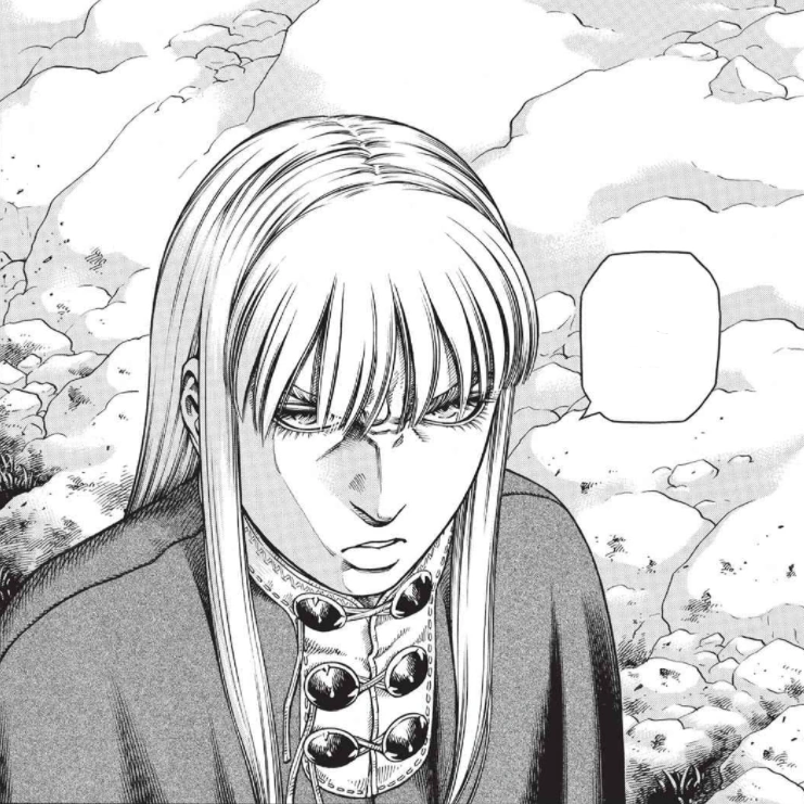 Canute looks at a cross atop a stone wall and supposes God is watching them even now, sitting on his throne and choosing to watch them lose their friends and see father and son kill each other. He says it is unforgivable and that he will create a worldly paradise on Earth, a place of peace and prosperity ideal for those who live in suffering. He notes that the work may be finished after his time, but that he will take the first step. He smiles that when his time comes, God will surely call him to His side with love, and that he'll be able to tell him that they no longer need Heaven or his trials, as they have their own Paradise on Earth. Canute says they must take back what they have lost, even if it means becoming demons. Askeladd tells him he will have his assistance.