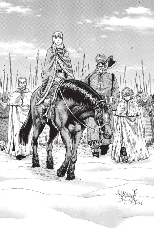 In January 1014, Prince Canute arrives on horseback, with Askeladd, Thorfinn, Thorkell and Thorkell's five hundred men behind him. Thorkell says hello to Floki and tells him he's up for a duel if he is, but Canute tells him to stand down. Floki cannot believe what he is seeing. Canute tells him he sent a herald days ago with news of his return and asks him if he always greets princes with armed men. Floki notices Askeladd behind Canute. Askeladd smirks at him and Floki demands to know what he is doing with the prince. Canute asks him if he is hard of hearing and how he dares draw arrows against a prince of Denmark. Floki tells him no and that the Jomsvikings are loyal, but that they received an inaccurate report about an ambush. Canute tells him not to form ranks when he's not certain and tells him to send an accurate report to King Sweyn that he will visit his hold by evening. Floki thinks Canute seems like an entirely different man.