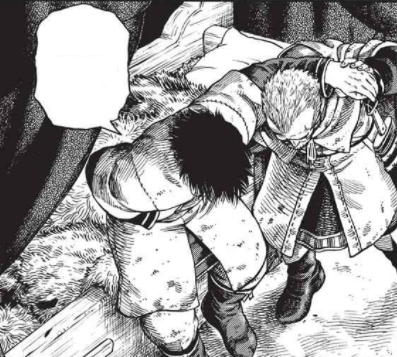 In Gainsborough, Askeladd helps the wounded Bjorn sit down on the bed in a room Prince Canute arranged for him. He tells him to rest for now. Bjorn jokes that it's pretty cramped after he risked his life. Askeladd tells him a servant will change his bandages later and to stay off his feet until then. Bjorn tells Askeladd that he saw where he got hit, and that he might be dead by the time the servant gets there. Askeladd tells him that Atli wanted to apologize to him. Bjorn brushes it off and says that unlike Thorfinn, he doesn't hold grudges and what happens on the battlefield stays on the battlefield. Askeladd smiles and says he's off to speak with King Sweyn and that he will see Bjorn the next day. Before he leaves, Bjorn sits up straighter and asks Askeladd how wounded his leg is. Askeladd replies that it took plenty of arrows and will take time to heal, but that he can still swing his sword. Bjorn smiles and reiterates he'll see him tomorrow. Askeladd agrees and leaves.