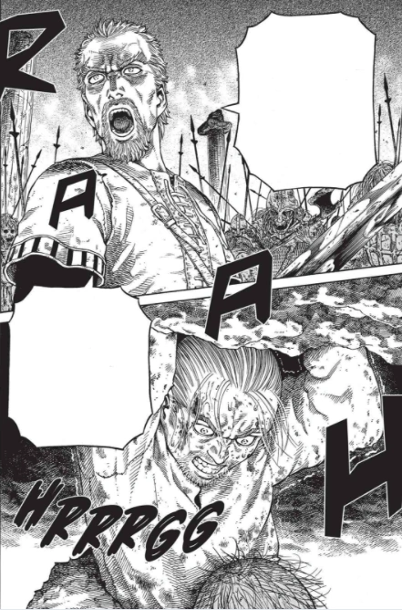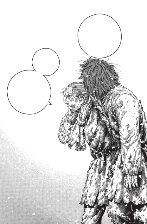 Thorfinn hangs down, holding on to the earth's walls, as grotesque dead warriors wage war underneath him. He realizes, surprised, that they are laughing. He notices one of the dead soldiers is Bjorn. Askeladd, sitting on a tall pillar nearby with his bloody sword leaning on his shoulder, laughs and asks Thorfinn if he is still stuck up there, telling him it's been a while. He tells Thorfinn he never learns, since he came back again. He asks Askeladd if they're in Valhalla, but Askeladd tells him that would be much nicer and that this is the real world and an ultimate state of warfare, where all the shit winds up, the final destination of all warriors, where everyone is an enemy and no one ever wins or loses. He asks Thorfinn if he remembers that he used to live there, until he escaped, for better or worse, by getting hollowed out. Askeladd says he may not be in any position to say it, as the man who dragged him there, but that Thorfinn is lucky, since few ever get to leave. He asks Thorfinn what fills him now, since being a warrior was all that he was, but it's now all drained away. Thorfinn regretfully says he is still a warrior and that he's come back because he punched another man in anger. He laments that he is lowly and pathetic and never grows up or moves on. Askeladd interrupts his sob story and says that he can punish himself all he wants, but should open his eyes, since he's missing quite a sight.