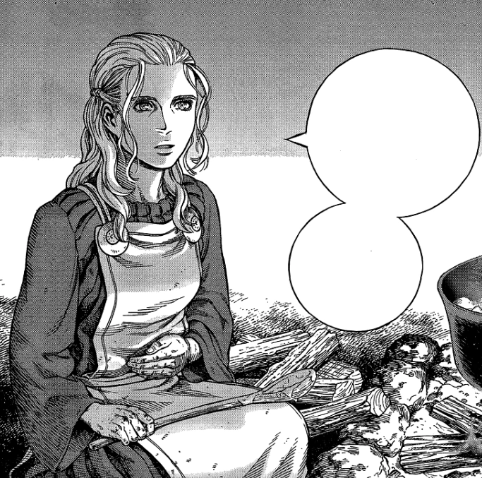 Inside, Arnheid makes food as Thorfinn and Einar sit at the table. Einar impatiently stands, but Arnheid asks him to sit down, as dinner is almost done. Einar says that they might be able to slip in and free Gardar if they act in the middle of the night. He asks Arnheid if she realizes that her husband will be executed if they don't do anything. Arnheid tells him that some things cannot be changed, and that in those moments it is better to do nothing, to stay still and wait for the storm to pass. She notes that she doesn't want Einar to get caught up in it. Einar asks her if she doesn't love her husband; Arnheid replies that she does. She says that although their parents arranged their marriage, he was kind and gentle with her and their son. Einar says that if that's the case, they should do something, even if it means fighting Snake and the others. He tells her that there are times they have to fight to win freedom, and aks Thorfinn if that's right. Thorfinn seems troubled and doesn't answer. Einar starts to tell Thorfinn he'll need his help to lure away the guards, but Arnheid interrupts him. She says she lost her son because of pots and pans and asks Einar to let her share a bit of her past.